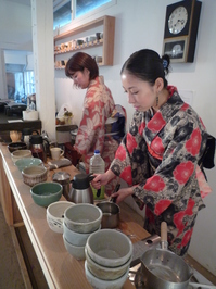 乙女部カフェでは着物姿で抹茶を立ててくれます。ワッフルも焼き立てホカホカ。。。